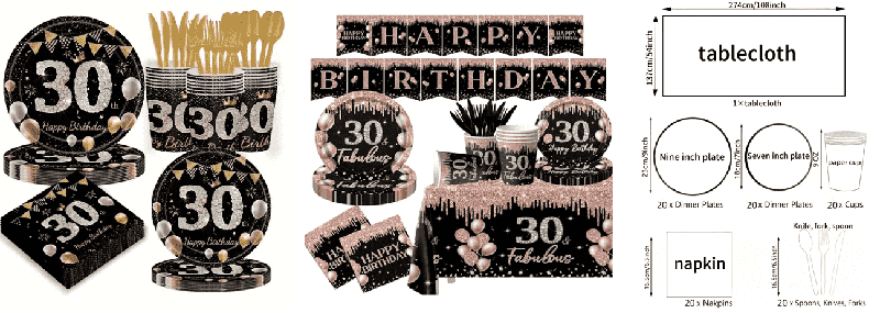 Set cutlery hari jadi pakai pakai termasuk plat kertas 7 inci, plat kertas 9 inci, serbet, pisau plastik pakai buang, garpu dan sudu. Reka bentuk meja makan adalah ringan dan tahan lama, sesuai untuk pesta ulang tahun dan majlis perayaan lain, plat 7 inci sesuai untuk memegang kek atau makanan ringan, plat 9 inci digunakan untuk makanan utama, tuala menyediakan kemudahan pembersihan, pisau plastik, garpu dan sudu membuat makanan bersih, boleh digunakan selepas penggunaan, menghapuskan masalah pembersihan.