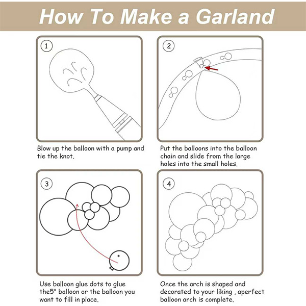 Perhatian & Amaran:Tolong JANGAN penuhkan belon dan juga elakkan selaran matahari, terlalu panas, objek runcing dan geseran yang berlebihan. Kawal jumlah udara yang ditiup ke dalam setiap belon untuk mencapai saiz belon ideal anda, nikmati pesta kit Balloon Garland Arch anda.