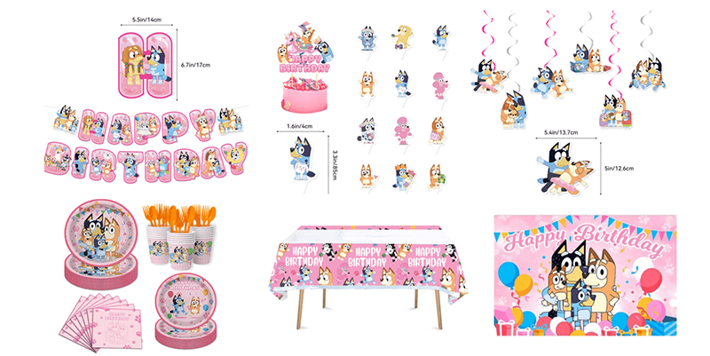 Banner kertas termasuk dua gaya teks dan bentuk, yang dipadankan dengan watak -watak tema Bluey untuk menyampaikan suasana yang menggembirakan hari jadi dan echo reka bentuk tema Bluey Balloon. Kedua -dua gaya ini boleh digunakan bersama -sama untuk menutup susun atur latar belakang dan butiran, menjadikan seluruh hiasan parti mempunyai rasa hierarki.