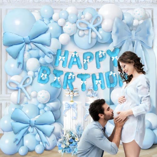 Set ini termasuk belon warna biru macaroon dalam 5 inci, 10 inci, 12 inci dan 18 inci, warna putih matte dalam 5 inci, 10 inci, sepanduk selamat hari jadi, belon busur biru macaroon foil, belon panjang 260 panjang macaroon biru, busur reben, titik gam dan jalur hiasan belon.