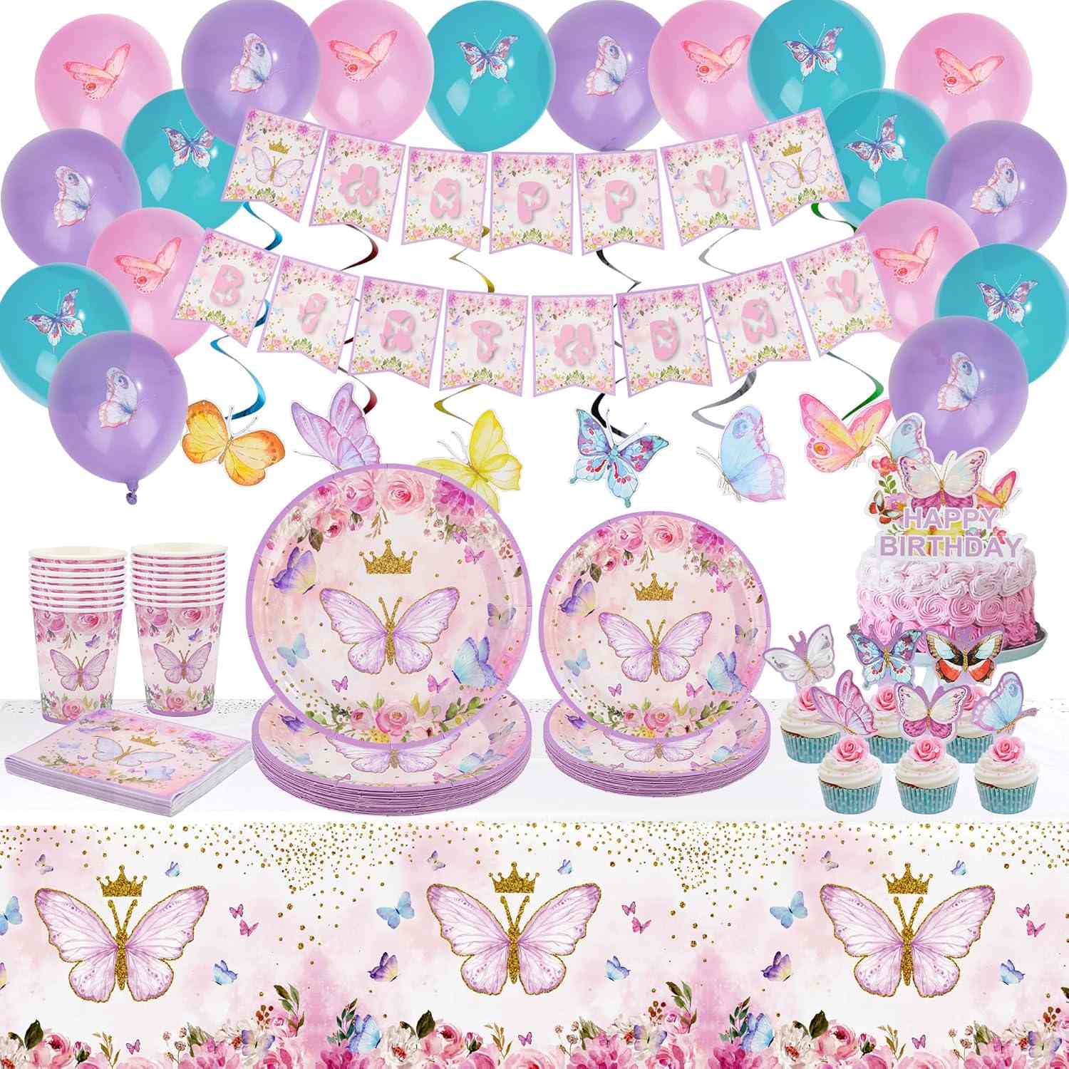 Pilihan terbaik untuk hiasan parti ialah set pinggan mangkuk parti rama-rama. Termasuk ialah serbet, pinggan kertas, cawan kertas, garpu dan pisau. Setiap bahagian menunjukkan bahagian rama-rama.