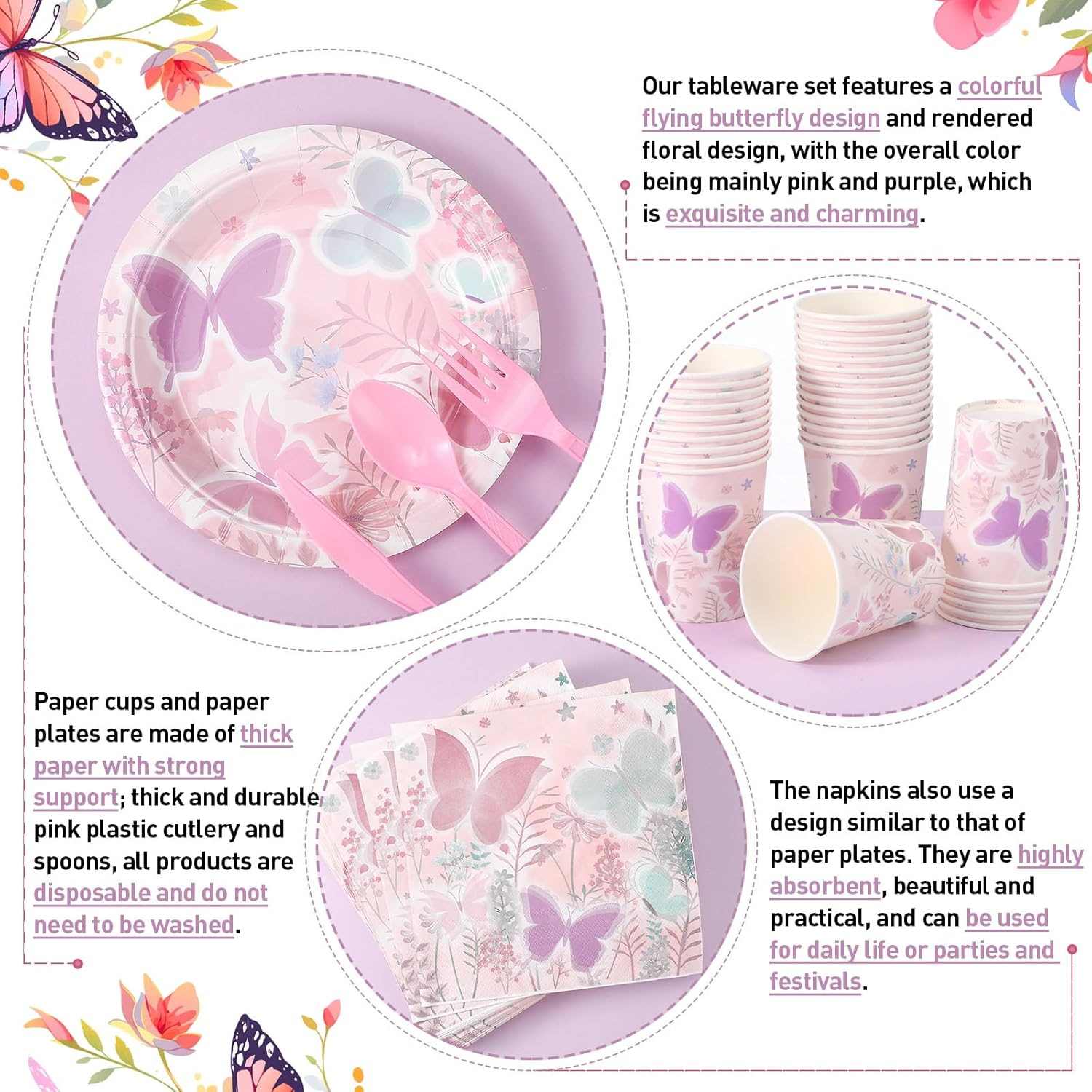 Napkin mempunyai gaya yang sama dengan tema. Mereka menunjukkan rama-rama dan bunga yang cantik. Kertas itu terasa tebal dan lembut. Ia mengambil air dengan telaga. Ia berfungsi untuk membersihkan semasa makan. Ia juga boleh menjadi perincian meja kecil yang menjadikan pesta itu kelihatan menarik.