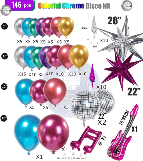 Thekit gerbang belon diskoterutamanya terdiri daripadabelon lateks berwarna-warni danpelbagai belon foil. Untuk menjadikan gaya krom berkilat, belon lateks yang kami sediakan ialah belon lateks logam, permukaannya mempunyai kilauan logam yang sangat cantik, dan ia boleh mencapai hasil yang cemerlang di dalam dan di luar rumah. Saiznya ialah 5 inci, 10 inci, 12 inci dan 18 inci.