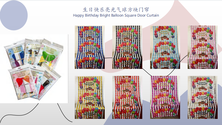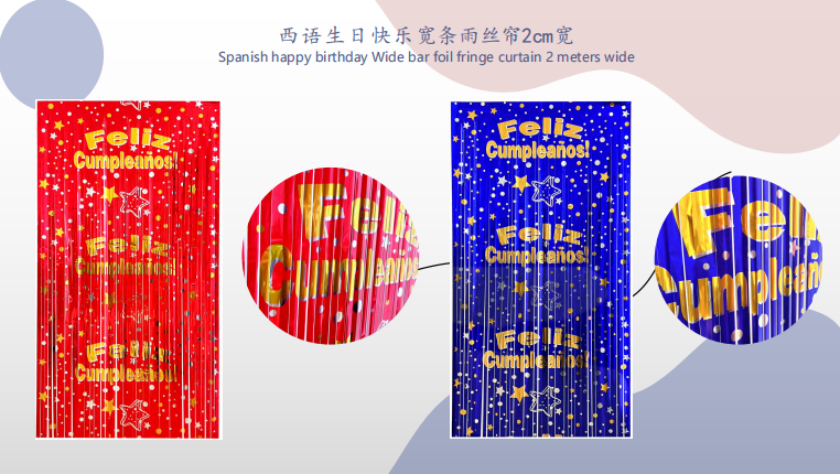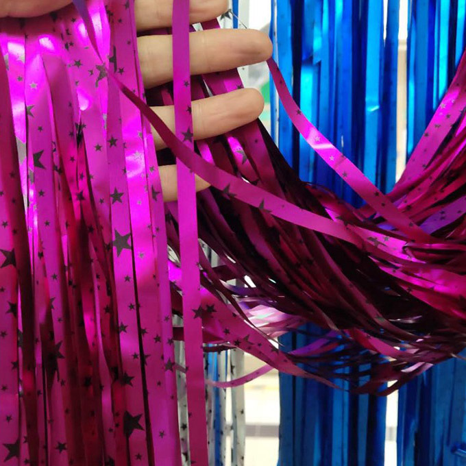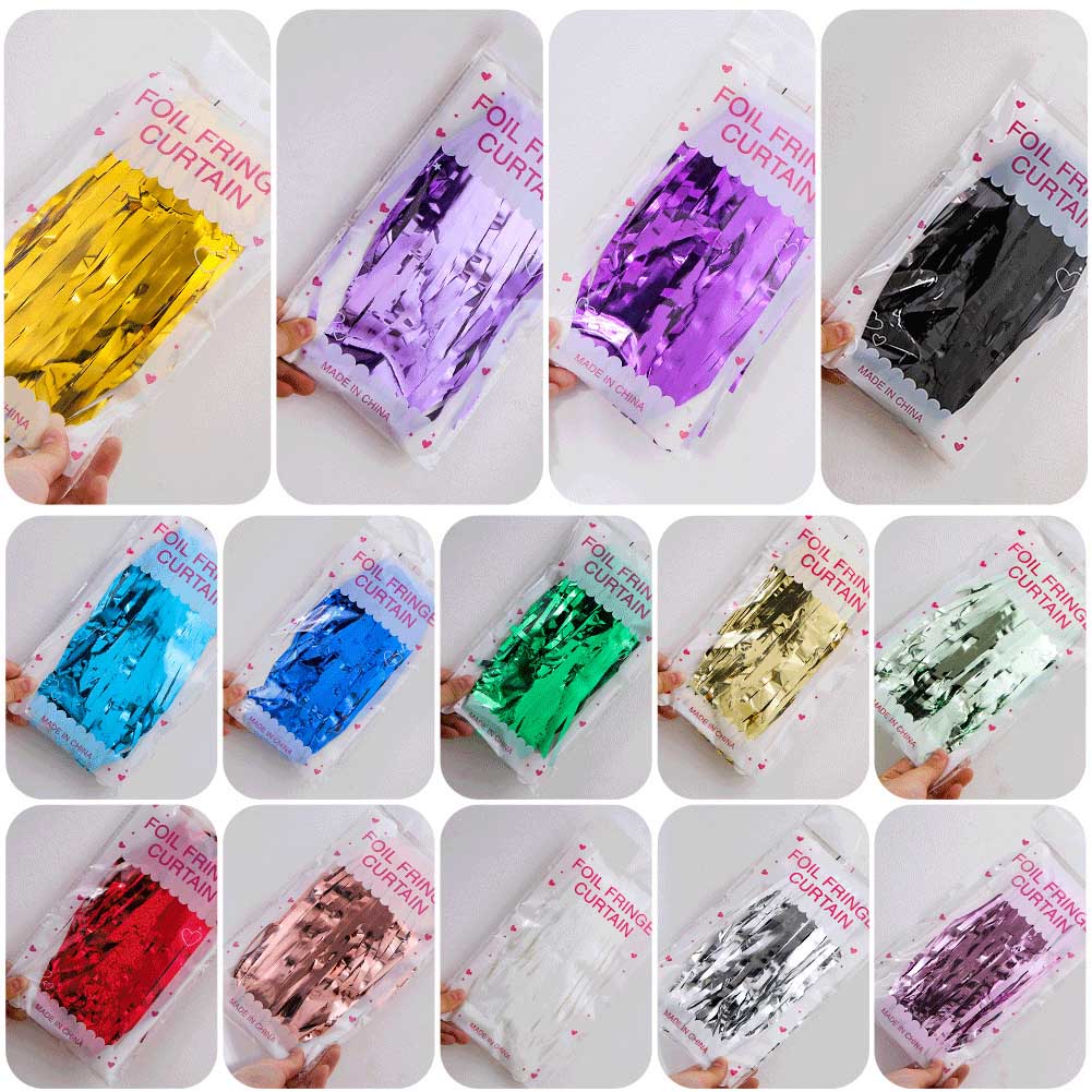 Tirai foil dengan warna pelangi, warna macaroon dan kombinasi warna lain sesuai untuk pesta ulang tahun kanak -kanak. Terdapat juga langsir kerajang berkilat seperti emas dan perak, yang sesuai untuk pesta ulang tahun dewasa, perayaan ulang tahun, dan lain -lain. Mereka boleh diatur di tapak parti, dewan perjamuan hotel, dll.