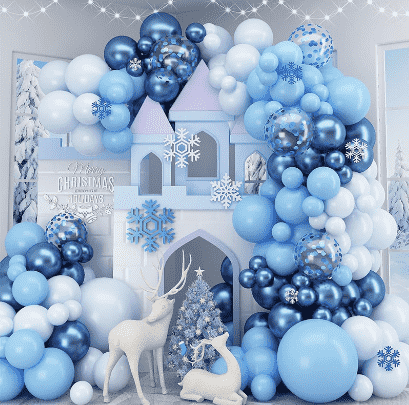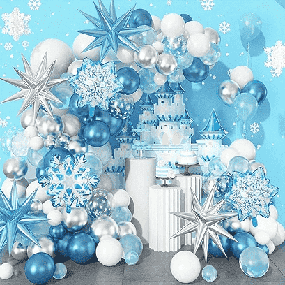 3.Kit kalungan belon bekubiasanya mengandungi pelbagai saizbelon beku, belon foil unik, reben hiasan yang sepadan, inflator, bintik gam yang tidak bertanda, ikatan pemasangan dan aksesori lain untuk memenuhi keperluan susun atur dalam sehenti. Semua komponen diperbuat daripada bahan yang selamat dan mesra alam, disesuaikan sepenuhnya dengan adegan aktiviti kanak-kanak. Corak belon dalam sut itu dipadankan dengan teliti, menggabungkan imej watak klasik Frozen dengan unsur ais dan salji yang indah. Warna-warna biru, putih dan perak, mewujudkan suasana sihir yang tulen dan romantis.