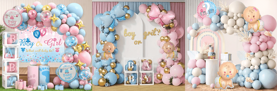 Kit belon asas terutamanya dipadankan dengan dua warna utama merah jambu dan biru, dan beberapa belon sequin dan surat aluminium huruf warna yang sama ditambah sebagai hiasan.