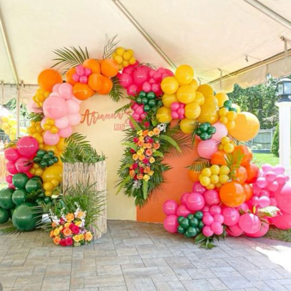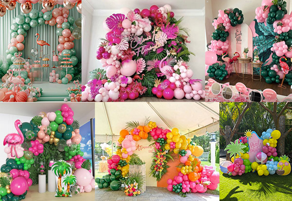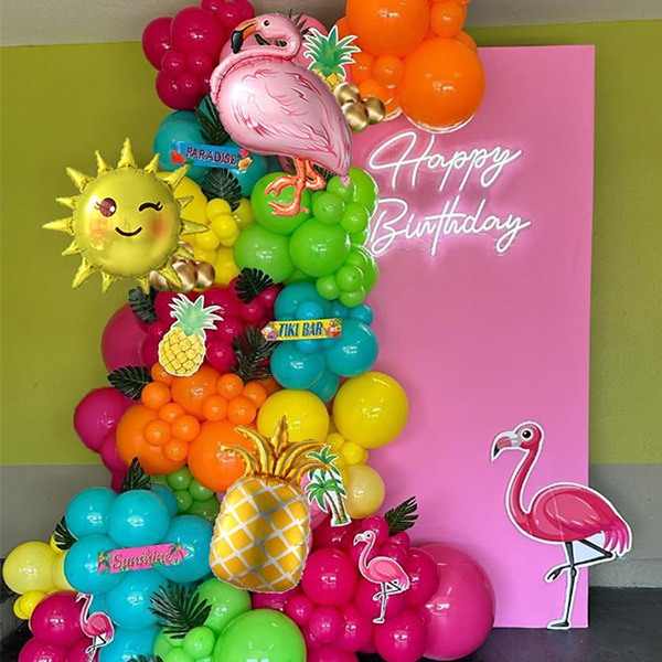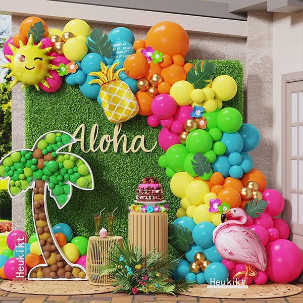 Kami boleh menyesuaikannya dengan tema anda sendiri, memilih palet warna unik anda sendiri. Sebagai contoh, menambah beberapa belon bertema retro akan mewujudkan suasana tropika dan perayaan untuk tempat anda, sambil menambah sentuhan glamor ke kit belon Hawaii anda.