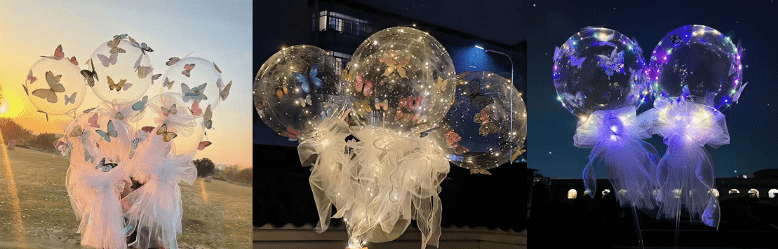 Balloon Bobo sendiri adalah telus dan mudah, yang sangat konsisten dengan fleksibiliti pemancar cahaya pelekat rama-rama berongga. Penggunaan teras pelekat adalah untuk menaik taraf belon yang membosankan ke bola penggantungan tarian rama-rama, dan membuat belon fokus adegan melalui bentuk tiga dimensi rama-rama dan kesan cahaya dan bayangan. Pesta ulang tahun kanak -kanak, pesta ulang tahun dewasa, kawasan selamat datang perkahwinan, aktiviti pusat membeli -belah, hiasan rumah percutian sangat sesuai. Pada waktu malam, ia juga boleh dipadankan dengan lampu LED, yang sangat menarik.