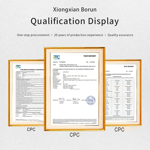 ASTM F963 (Standard Keselamatan Mainan A.S.):Memastikan produk memenuhi keperluan bukan ketoksikan pasaran A.S. dan sesuai untuk kegunaan kanak-kanak dan dalaman. Pensijilan ini adalah wajib untuk Amazon dan pasaran A.S.. Jika anda membeli belon daripada kami secara borong, kami akan memberikan anda kebenaran untuk menggunakan pensijilan tersebut.
