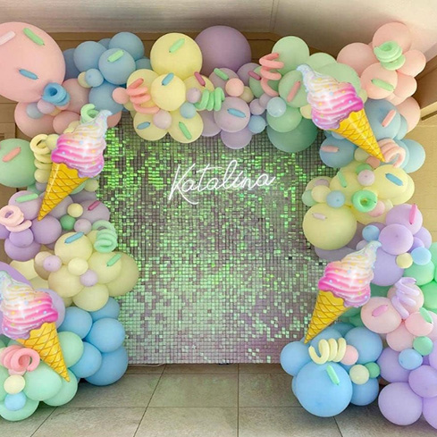 Kilang Balloon Niun® menyediakan perkhidmatan penyesuaian Garland Garland percuma. Cukup beritahu kami logo dan konsep reka bentuk gambar anda, dan kami akan membuat pakej balon ais krim macaroon yang dimiliki oleh anda. Pasukan reka bentuk profesional kami akan mengoptimumkannya dan memulakan pengeluaran sehingga pelanggan berpuas hati.