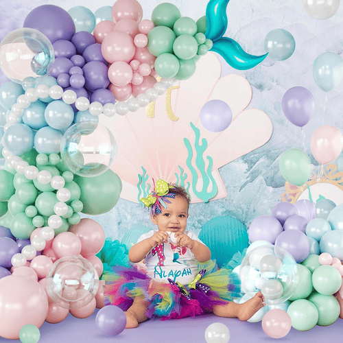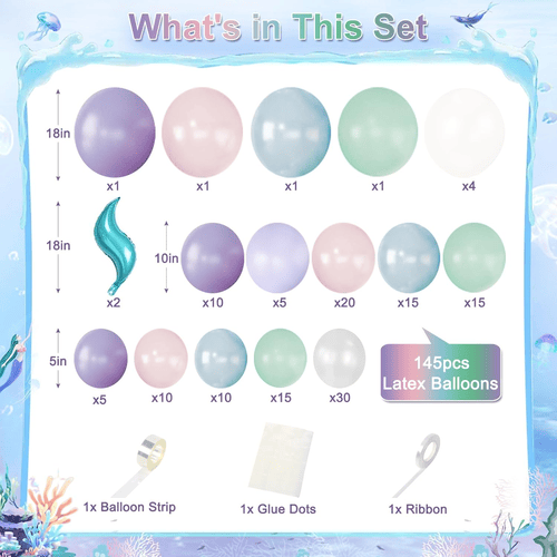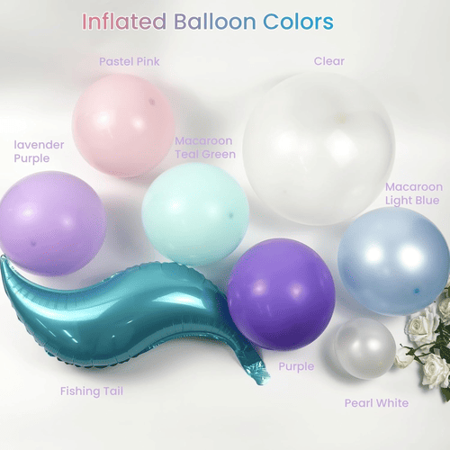 Belon dalam kalungan belon Mermaid didatangkan dengan pelbagai warna, seperti ungu, lavender, merah jambu pastel, biru muda, hijau teal, putih mutiara dan lutsinar, bersama-sama dengan hiasan ekor ikan duyung foil, menjadikannya hebat untuk mencipta pesta bertemakan laut ikan duyung yang ajaib.