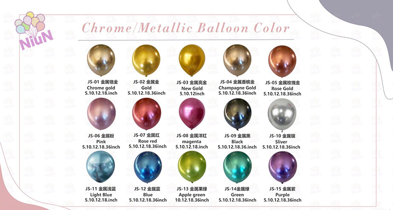 Kami menggunakan teknologi salutan dakwat yang diimport untuk belon logam kami. Warnanya sekata dan kaya. Ambil yang dalam gambar sebagai contoh. Ia termasuk emas champagne metalik, biru metalik dan ungu metalik. Warna-warna ini terbukti popular di pasaran Eropah dan Amerika. Mereka sesuai untuk banyak kesempatan. Majlis-majlis ini adalah perkahwinan, hari jadi dan ulang tahun.