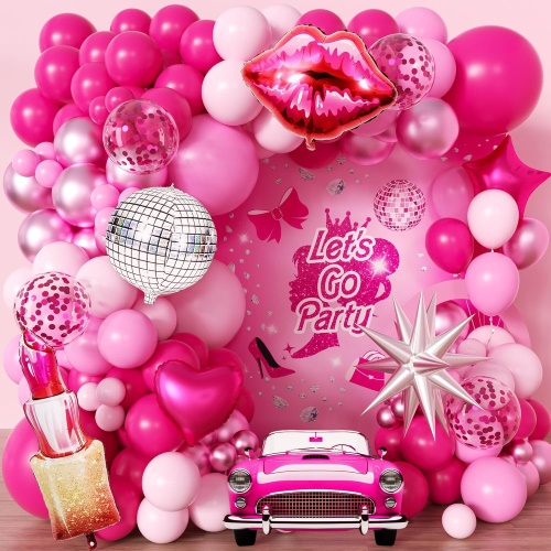 Set termasuk belon lateks merah jambu matte 5inci dan 12inci, belon lateks merah jambu mutiara 5inci dan 12inci, belon lateks merah jambu metalik 5inci dan 12inci, belon lateks putih 5inci dan 12inci, belon lateks confetti merah jambu 12inci, belon foil foil merah jambu 18inci, kerajang merah jambu 18 inci, belon foil merah jambu merah jambu dan putih belon foil, hiasan rama-rama dan aksesori seperti titik gam, jalur belon dan reben.