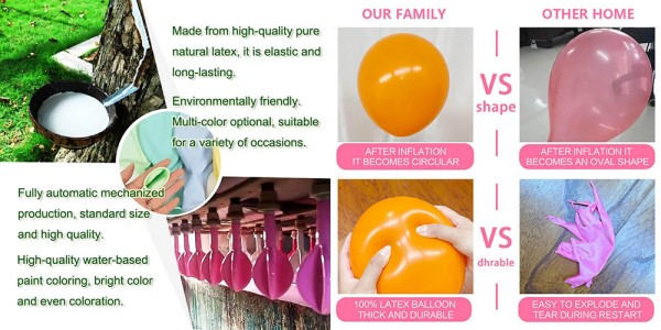 Tekstur yang lebih kuat: Oleh kerana penggunaan bahan mentah berkualiti tinggi dan teknologi canggih, setiap belon lateks kami mempunyai tekstur yang sangat kuat dan warna yang kaya.